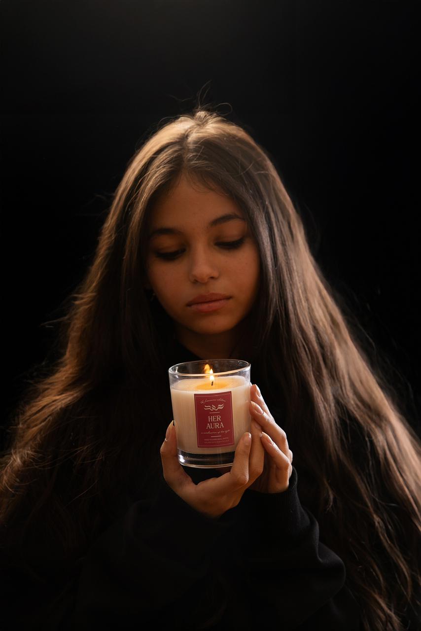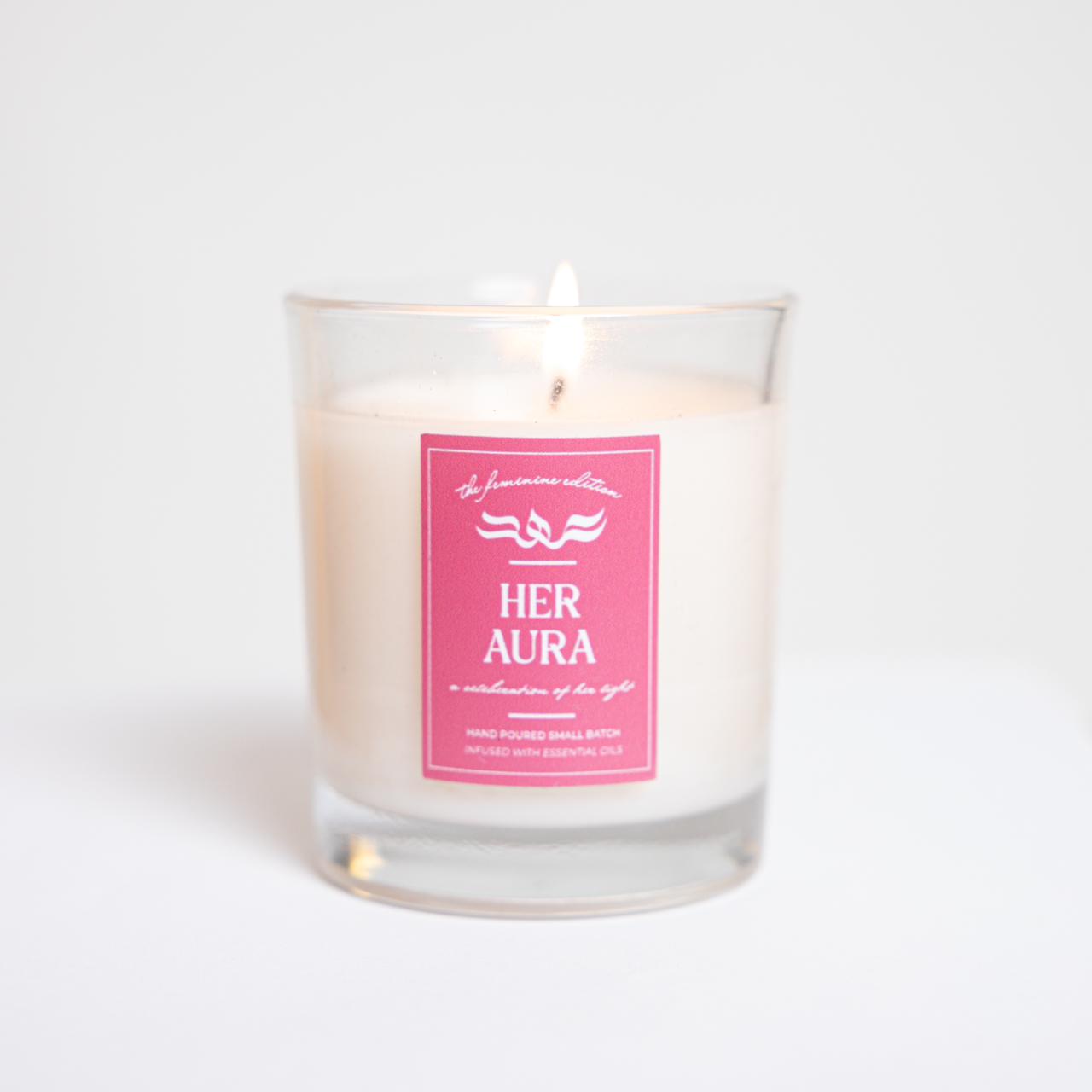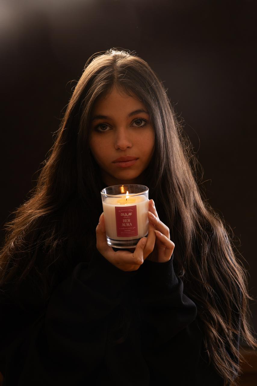 Her Aura embodies feminine energy — soft rose, warm vanilla, and pink sugar blending into a gentle, comforting glow that feels calm, graceful, and deeply inviting.